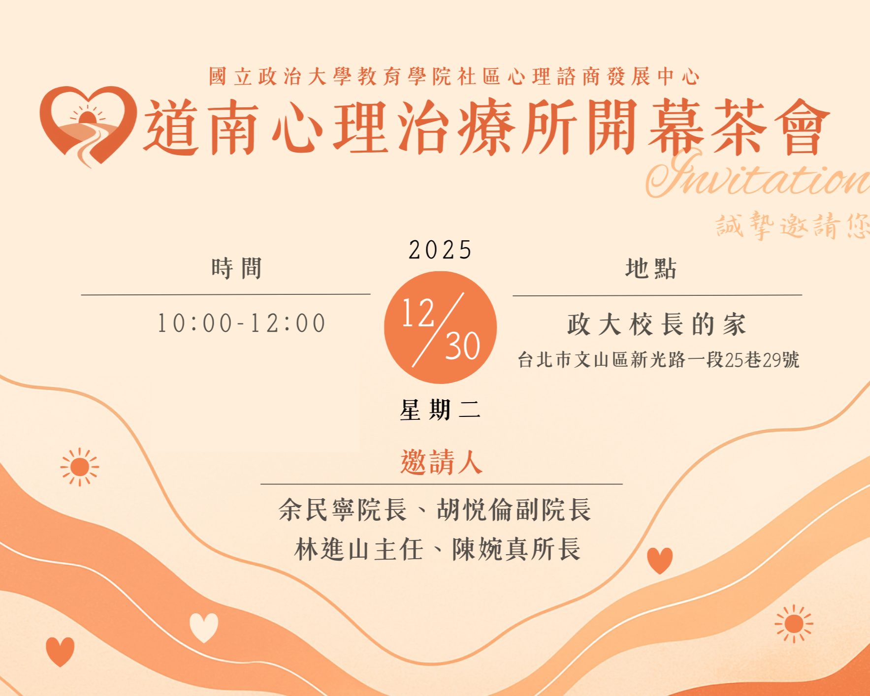 道南心理治療所將於2025/12/30星期二上午10:00-12:00於政大校長之家(台北市文山區新光路一段25巷29號)舉辦開幕茶會。